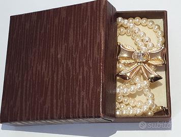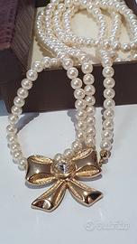 Elegante Collana di perle di vetro da 4 mm vintage color bianco a doppio filo, impreziosita da un grazioso pendente a forma di fiocco che funge da chiusura.
