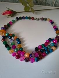 Collana nuova in agata naturale colorata, composta da tre fili scalati con perle tonde di diametro variabile. Le pietre mostrano venature e trasparenze tipiche dell’agata, con palette vivace (fucsia, verde, arancio, blu, viola) che crea un effetto cromatico dinamico ma equilibrato. Montaggio infilato a mano con nodi/distanziali tra le perle; struttura a tre giri che riempie il décolleté senza risultare rigida. Chiusura con gancio in acciaio. Stile statement contemporaneo con richiamo artigianale.