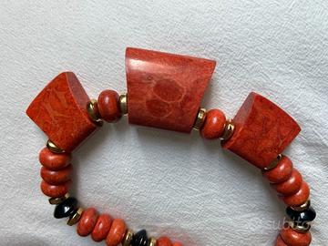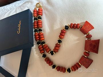 Collana di pietre naturali: le pietre rosse sono madrepore, quelle nere sono onice, legate da metallo. La madrepora è la pietra gioiello del mare, molto leggera e resistente. I tre pezzi centrali hanno una bella macchia. Lunghezza della collana: 26 cm. La collana è venduta nella sua scatola originale. Carlos Martini è un artista spagnolo, che crea gioielli.