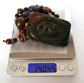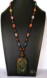 Collana di protezione - Feng shui - composta da pietre naturali in varietà di Tormalina Verdelite, Diaspro Brecciato, Agata e Ossidiana. Ricavata da un amueto con decorazioni anulari del Drago Celeste.