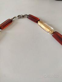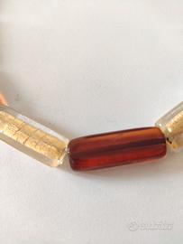 Collana di resina rettangolare color ambra e color oro, lunghezza 47cm. Poco usata