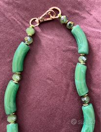 Bellissima collana lunga a due fili, realizzata con resina verde e dettagli dorati.