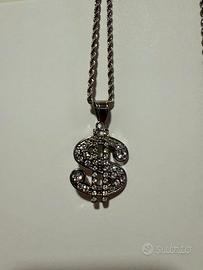 Parole chiave integrate: collana dollaro, pendente $, acciaio inossidabile, catena spirale, collana 60cm, gioiello urban, streetwear, hip hop style, accessorio brillante, regalo uomo donna, moda audace, zirconi scintillanti.