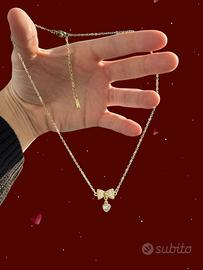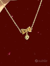 Collana da donna in acciaio inossidabile color oro, con pendente a fiocco decorato e piccolo cuore luminoso. Ha uno stile romantico e femminile, perfetto per chi ama accessori delicati ma ben visibili.