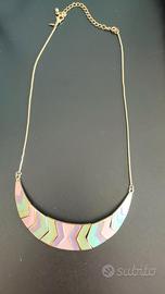 Vendo splendida collana da donna Avon originale, dal design moderno e raffinato. Realizzata in metallo dorato con inserti smaltati multicolore (rosa, lilla, verde acqua), presenta una forma a mezzaluna che dona un tocco vivace e chic a ogni outfit.
