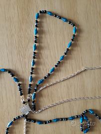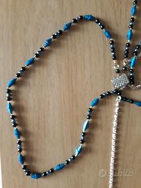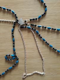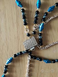 Collana da donna di bigiotteria in color oro e perle blu. Buono stato. Molto particolare con 4 collane che si vanno ad attaccare ad un solo pezzo.