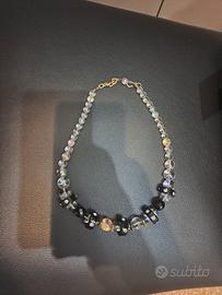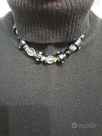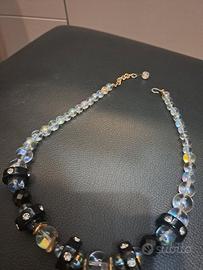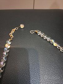 Collana elegante con perle trasparenti effetto iridescente e inserti in cristallo nero sfaccettato. Presenta dettagli con strass che donano luminosità e un tocco raffinato. Chiusura con catenina regolabile. Perfetta sia per outfit eleganti che per dare carattere a look più semplici. Condizioni: ottime, come da foto.
