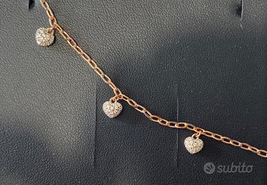 Set di collana e bracciale donna coordinato Nomination in argento 925. Catenina color rose gold e ciondoli pendenti a cuore con zirconcini silver (3 ciondoli per il bracciale e 5 per la collana) I prodotti sono nuovi, originali e mai indossati, muniti di confezione originale ed etichetta, in ottimo stato (prezzo inferiore al mercato)