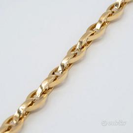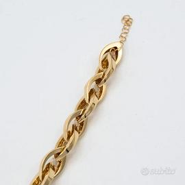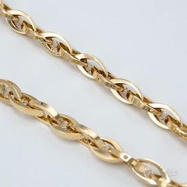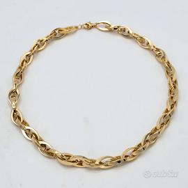 Collana donna molto importante in oro giallo 18 kt grammi 29,9 lunga cm. 45 + 2 di catenella. La lavorazione è lucida ed è a maglie ovalizzate e scatolate che si intersecano tra loro. E’ possibile avere anche il bracciale che unendolo al girocollo si ottiene una collana lunga. Prodotto made in Italy munito di marchio di fabbrica come da legge e completo di confezione e certificato di qualità rilasciato dalla Gioielleria.