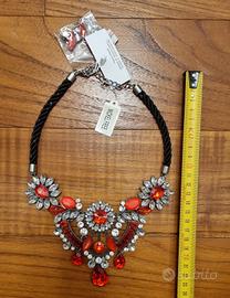 Collana da donna con un design elaborato e dettagli scintillanti. Perfetta per aggiungere un tocco di eleganza. - Decorata con pietre rosse e trasparenti. - Completo di sacchettino con pietre di ricambio - Cordino nero intrecciato. - Chiusura a moschettone con catenella di estensione. - Nichel free. - Mai indossata - Idea regalo