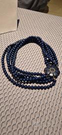 2 collane in pietre blu con chiusura a gancio a fiore. Le collane sono indossabili sia singolarmente che assieme, una è composta da cinque fili e una da tre, quest'ultima ha un filo che in un punto presenta imperfezione come da ultima foto. Anche la lunghezze diversa tra le due è stata fotografata.