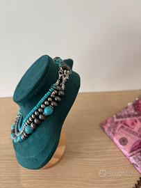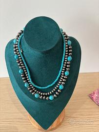 Collana doppio filo con perline turchesi e perline in metallo argentato, perfetta per un look boho e casual.