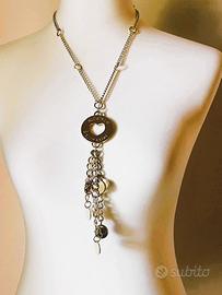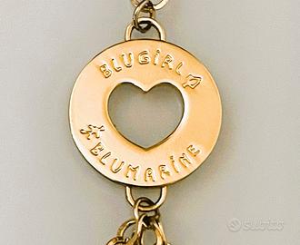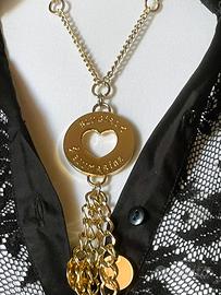 Splendida collana BLUMARINE in metallo dorato, catena intervallata da piccole maglie a cerchio, grande charm rotondo con logo inciso più una serie di cinque pendenti a catenella di varie misure, ciascuno corredato di una placchetta tonda. Lunghezza della sola catena 54 cm; i pendagli e il pendente rotondo misurano insieme cm 18, quindi complessivamente la misura (con pendenti) è di 78 cm; perfetta mai indossata.