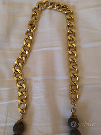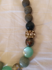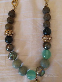 Collana a maglie dorate con pietre dure di diverse gradazioni di verde e pietre brillantinate.
