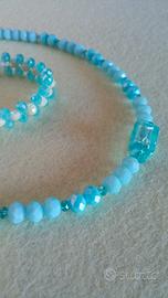 Collana e bracciale artigianali con cristalli color turchese, composizione unica di fantasia prodotta a mano.