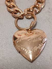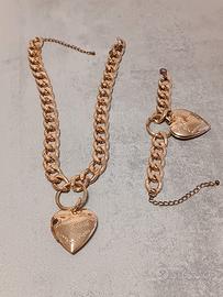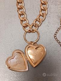 Collana e bracciale a catena dorata con ciondolo a cuore portafoto in bigiotteria, in ottime condizioni.