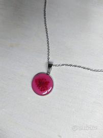 Collana e bracciale abbinato rigido in acciaio con ciondolo decorato a mano con resina colata rosa e fiori veri disidratati.