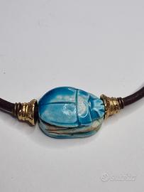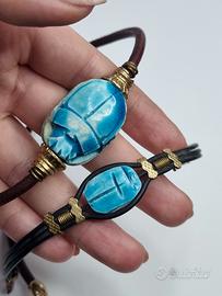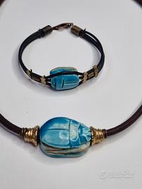 Bellissimo set composto da una collana e un braccialetto con ciondolo a forma di scarabeo egizio. Entrambi i gioielli presentano un design elegante e raffinato.