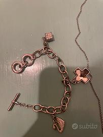 Collana deliziosa con un cuore e tre charms in acciaio e cristalli Swarovski(un cuore,un lucchetto e una chiavetta)e un bracciale molto bello con tre charms (un crocifisso riempito con un cristallo grigio perla,un dado con cristalli e un cigno di cristalli),il bracciale si può indossare da solo cioè sganciando i tre pendenti o con i tre charms.