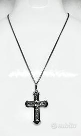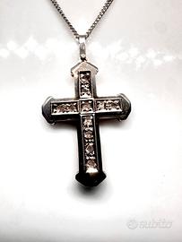 Collana in oro bianco 18kt con ciondolo a forna di croce in oro bianco 18kt e impreziosito da 11 diamanti naturali taglio rosetta.