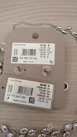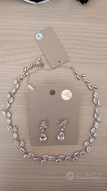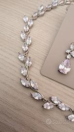 Parure di orecchini e collana in cubik zirconia con motivi a foglie. Brillanti e luminosi. Mai indossati, nuovi con cartellino. Perfetti come gioielli da sposa o cerimonia. Marchio Bijoux Brigitte.