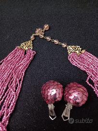 collana di fili di perline in vetro lilla, vintage anni 80 con orecchini a clips dello stesso colore in paillettes poco usati