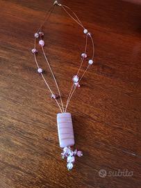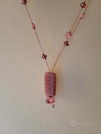 Parure di collana e orecchini con perline in vetro e quarzo rosa.