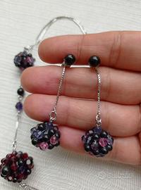 La parure include una bellissima collana girocollo con ciondolo a grappolo di cristallo multicolore e orecchini abbinati, il tutto incastonato in metallo color argento rodiato.