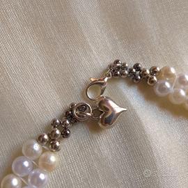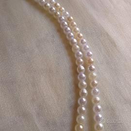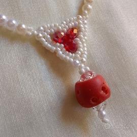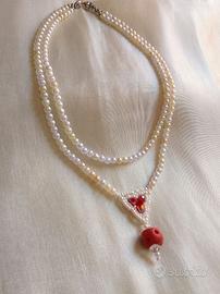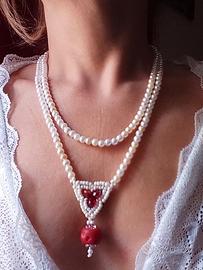 Collana artigianale vintage Multifilo con Perle di Maiorca e Corallo gemme Bambù Rosso. Stile anni 20 Questa collana multifilo coniuga estetica classica e stile contemporaneo, valorizzando il décolleté con un raffinato effetto a cascata. Le perle di vetro cerate, dalle sfumature lussuose simili alle naturali, si sviluppano su lunghezze di 45 e 50 cm. Il punto focale è un elemento geometrico a triangolo, composto da una fitta trama di perline avorio e cristalli cechi, con inserti rossi vibranti. Completa il pendente una pietra autentica di corallo bambù rosso dalla texture naturale. Un accessorio versatile e ricercato