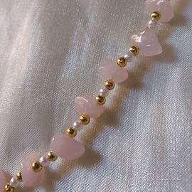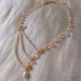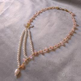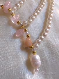Collana Elegante Perle schegge Pietre quarzo rosa