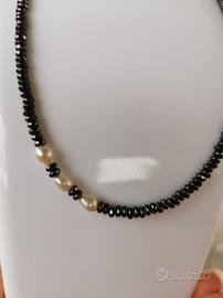 Collana donna / uomo con rondelle di Ematite sfaccettata e Perle d'acqua dolce naturali. Chiusura con moschettone in acciaio. Lunghezza 43 cm. Mai indossata