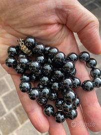 Collana in perle di ematite annodate a mano. Minerale noto per le sue numerose proprietà tra le quali: Ancoraggio e Protezione: È considerata una pietra di collegamento con un forte potenziale energetico e di ancoraggio, ideale per dissipare le energie negative e proteggere da situazioni sfavorevoli.