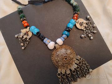 "Splendida collana etnica originale, realizzata a mano con elementi della tradizione africana (stile Berbero/Tuareg). Il pezzo forte è il grande medaglione centrale in metallo finemente cesellato, arricchito da una cascata di catenelle e campanellini che creano un delicato suono al movimento.