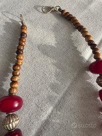 La collana è composta da grani in resina color rosso ciliegia (che sembrano essere in pasta di resina spesso chiamata "ambra fenolica" o bachelite nel mercato vintage) diverse dimensioni intervallati da perle in metallo argentato avorato. La parte finale vicino alla chiusura è rifinita con piccole perline in legno naturale per un comfort ottimale.
