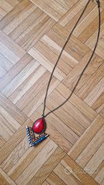 - Pendente con pietra rossa a goccia e dettagli in corda blu e arancione.