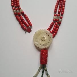 Collana a tre (3) giri di perle in coral-bamboo intervallato da altre in giada chiara (quelle grandi) e scura (quelle piccole). Al centro, grande medaglione in giada chiara riccamente inciso che nasconde nella parte inferiore la chiusura in argento marcato. Montata a suo tempo da un orefice e molto d'effetto.