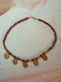 Elegante collana girocollo realizzata con grani di corniola e inserti dorati, chiusura posteriore, guarnita da cinque pendagli in metallo dorato.