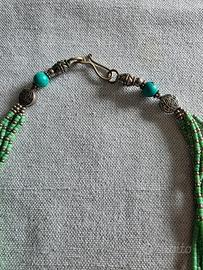 Splendida collana artigianale multi-filo realizzata con minuscole pietre dure verdi (come l'avventurina) intervallate da elementi in metallo e rifinite con pietre turchesi vicino alla chiusura. dettagli in metallo lavorato. Un pezzo di carattere, perfetto per chi ama lo stile etnico, boho o vintage.