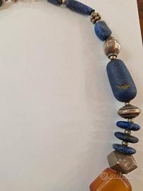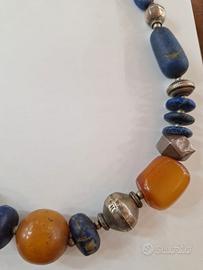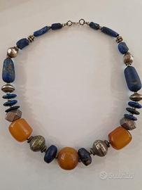 Gioiello antico Iraniano, con lapislazzuli di diversa forma e misura , ambra di grandi dimensioni intervallati di elementi in metallo lavorato in modo artigianale.