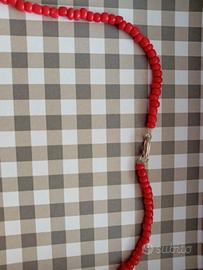 Collana etnica vintage anni 70-80 in perfette condizioni composta da grande ciondolo centrale decorato color argento e varie perline di dimensioni e forme diverse color rosso e argento.
