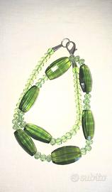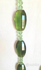 Elegante collana in vetro color verde chiaro e verde scuro. Trasparente con elementi grandi in vetro di 4x2.5 centimetri. Da chiusura a chiusura misura 77 centimetri. In ottime condizioni
