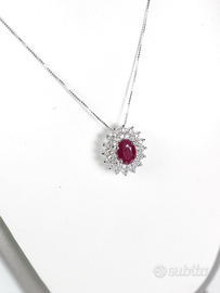 Collana fiore in oro bianco 750 18kt con rubino di massa stimata 0.70ct e diamanti di massa complessiva stimata 0.32ct, colore e purezza stimate G-VS.