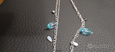 Lavorazione artigianale fatta a mano in Italia. Catena rodiata, anallergica nichel free. Girocollo lungo cm 42+ cm5 allungatura. N.2 gocce pendenti in Swarovski azzurro lunghe cm 2 cd poste nel girocollo ed altre due nella catena finale che rendono la collana di una lunghezza complessiva di cm 40. Arricchita anche da piccole gocce di cristallo opaco azzurro e palline di vetro grigio-azzurre.