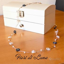 Una collana fatta a mano elegante e luminosa, perfetta per chi ama accessori raffinati dai toni neutri. I piccoli fiori ricordano la luce della luna e valorizzano il décolleté con discrezione.