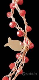 ciondolo centrale con nappina, pesce snodato colore oro e charms di corallo bamboo.