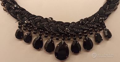 Collana di tendenza è un gioiello moderno impreziosito da elementi neri a goccia e dettagli intrecciati, ideale per completare outfit sofisticati. É composta da una spessa treccia realizzata in morbido tessuto, intrecciata con sottili catene metalliche argentate.