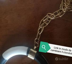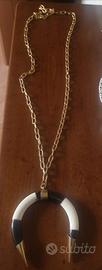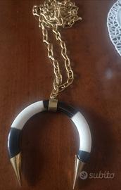 Collana a maglia ovali in acciaio con ciondolo di vero corno di bufalo. Lunghezza collana senza ciondolo è di 100 cm con gancio di chiusura in modo da indossarla anche a doppio giro e ad y. La collana presenta anche un link in modo da cambiare il ciondolo in qualsiasi momento con facilità. Prodotto creato a mano con materiali di ottima qualità. Il doppio corno in bianco e nero per ora è terminato ma sono disponibili altri colori. Il diametro del doppio corno è di 7,5 cm. Il corno è in osso con dettagli in ottone color oro. Possibilità di acquistare solo la collana. Per info contattemi