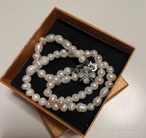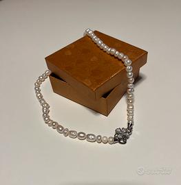 Girocollo con perle di fiume irregolari che conferiscono autenticità, di mm 7/8,chiusura quadrifoglio placcata oro, misura totale compresa chiusura cm 50