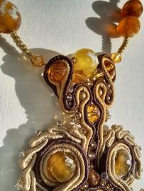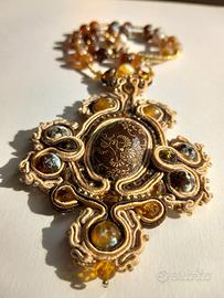 Lussuosa collana choker artigianale in stile gotico vittoriano, cucita in cordoncino di seta dorata, con cristalli Swarovski, pietre dure di agata striata naturale; al centro incastonato un legno ovale laccato e dipinto a mano.