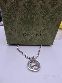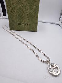 Bellissima collana lunga firmata Gucci in argento 925 con catena a pallini e il logo grosso delle G come ciondolo centrale.